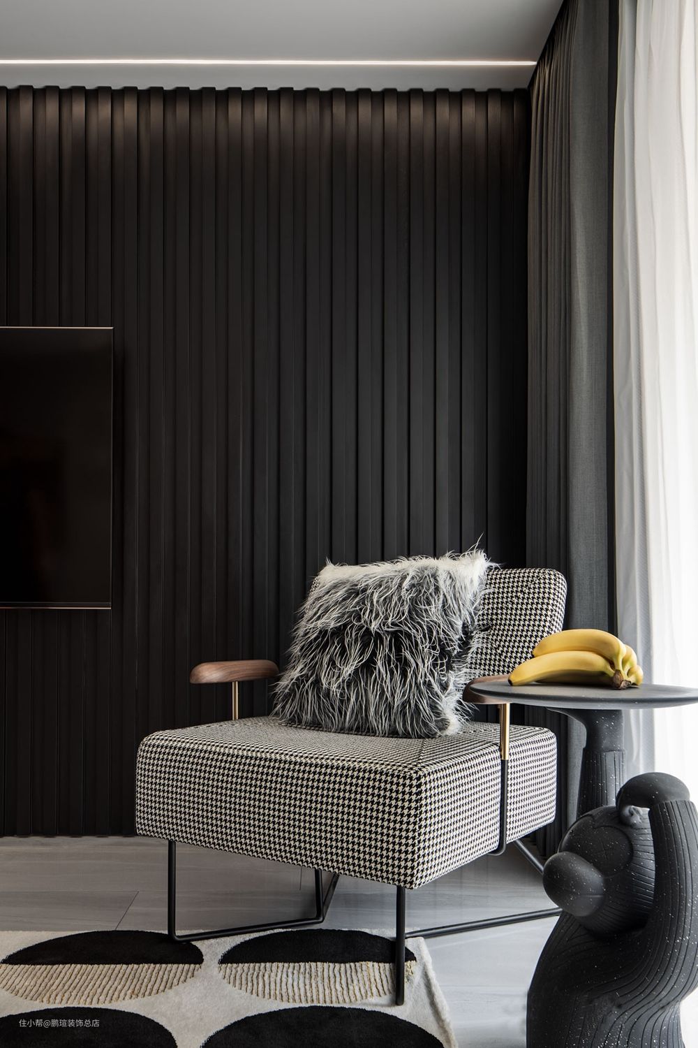 电视背景墙是一片纯黑色,做成木格栅造型营造更丰富的层次,又与深灰褶皱窗帘很好地衔接,使空间整体性很强。