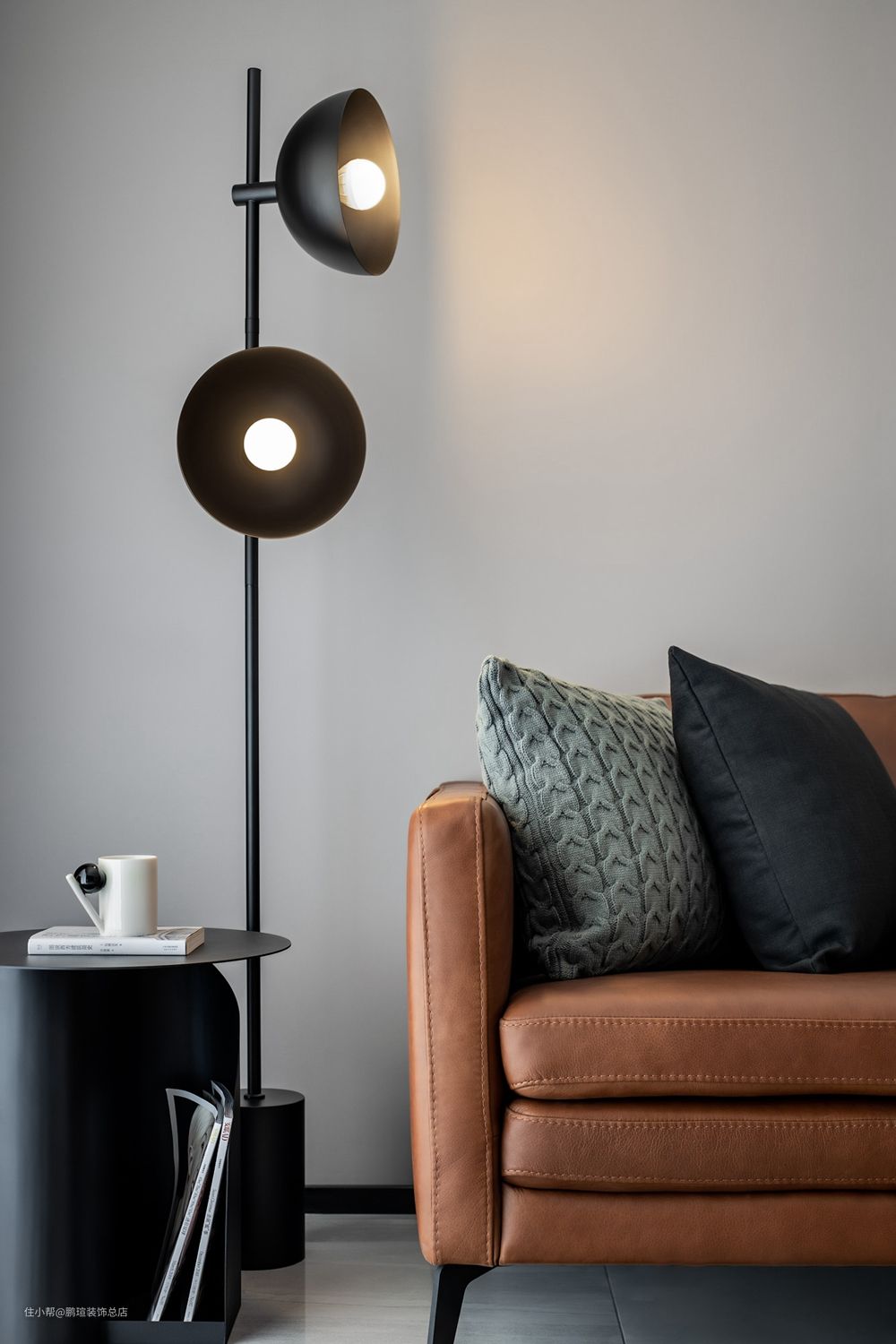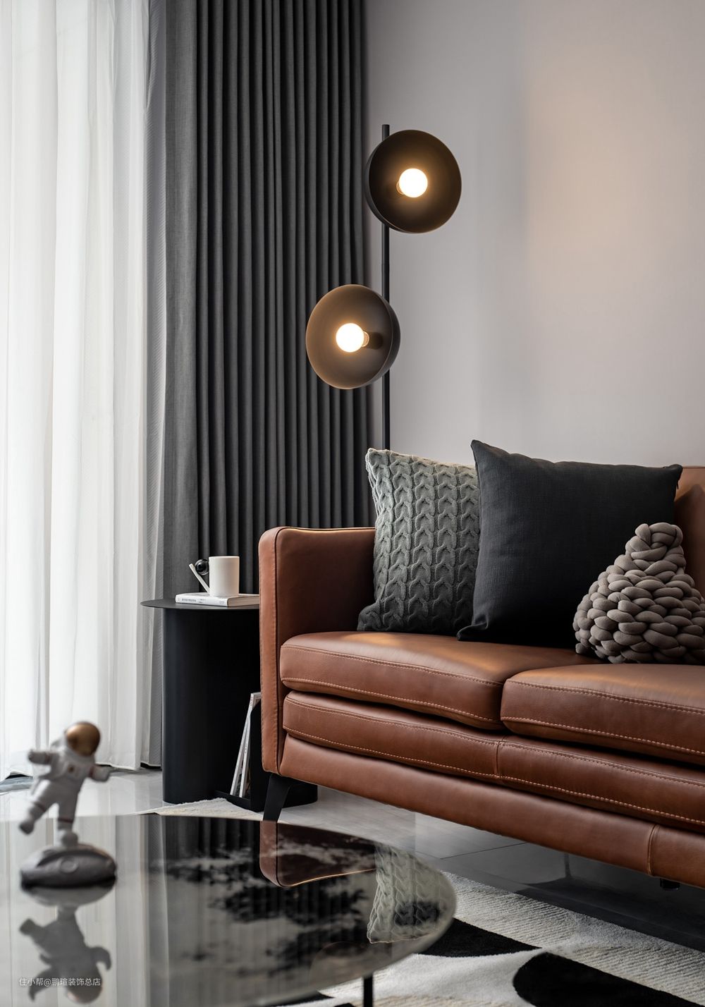 大理石座简约工业风双头落地灯自带时尚科技感,灯罩造型正面看如圆月侧面看如弦月,带有月光般轻柔皎洁的光晕,呼应了客厅中央的月球茶几。