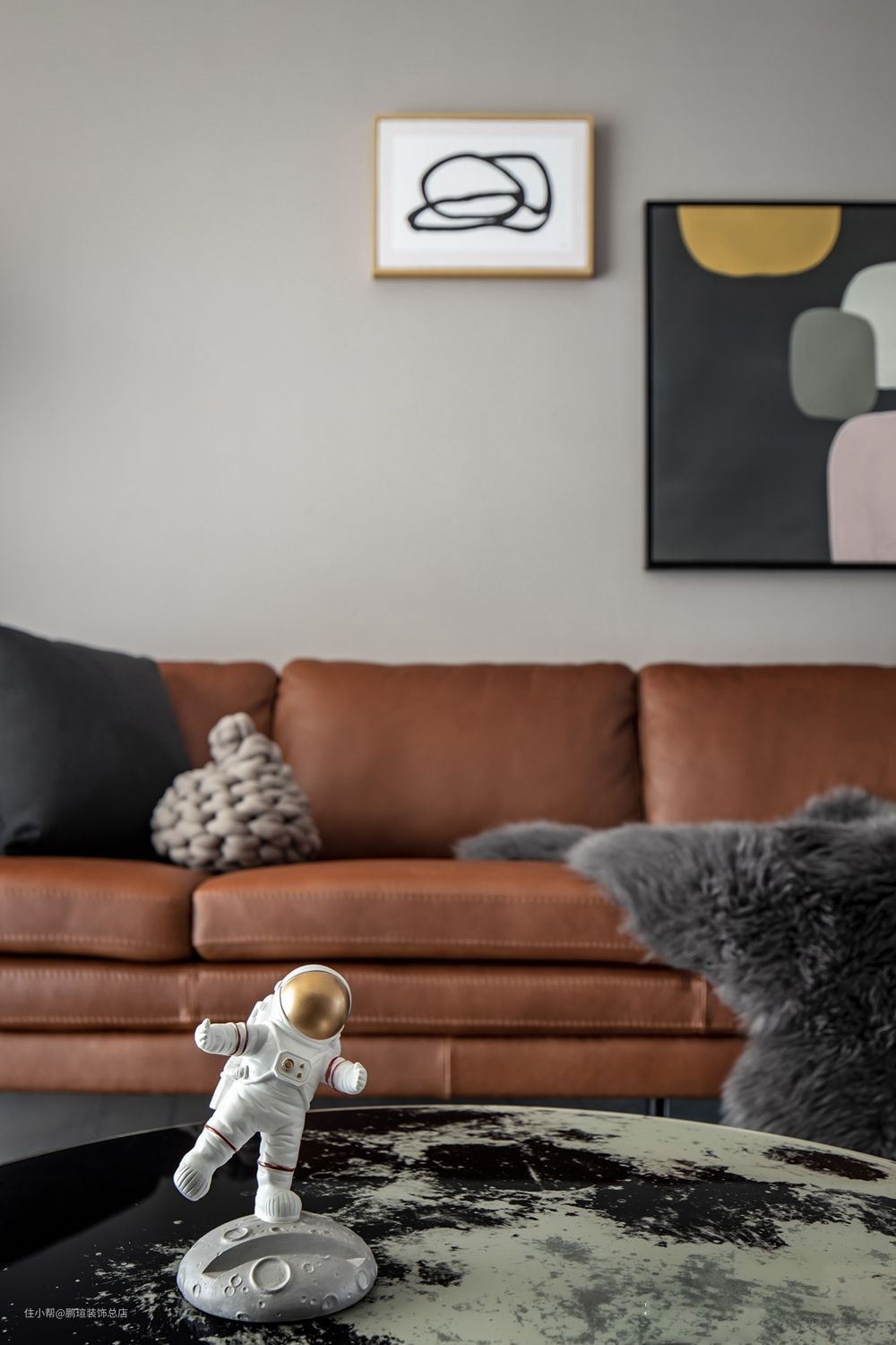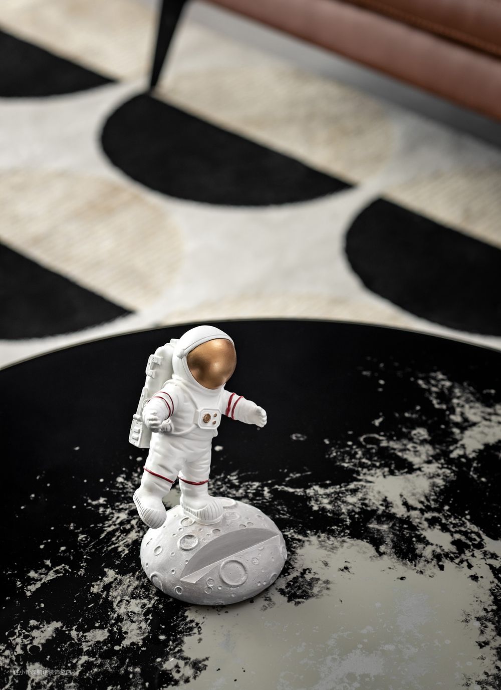 造型可爱的宇航员摆件放在月球图案的茶几上,象征着“遨游宇宙太空,勇敢探索未知的奥秘”,以生动形象的造型丰富了空间主题性,还可以被当做手机支架。