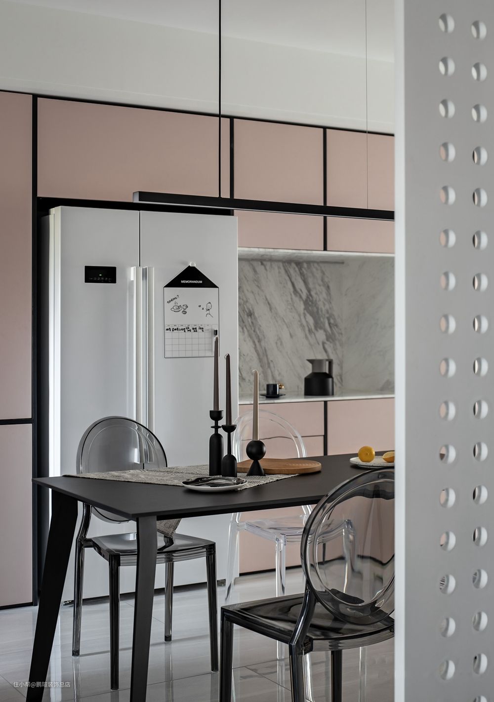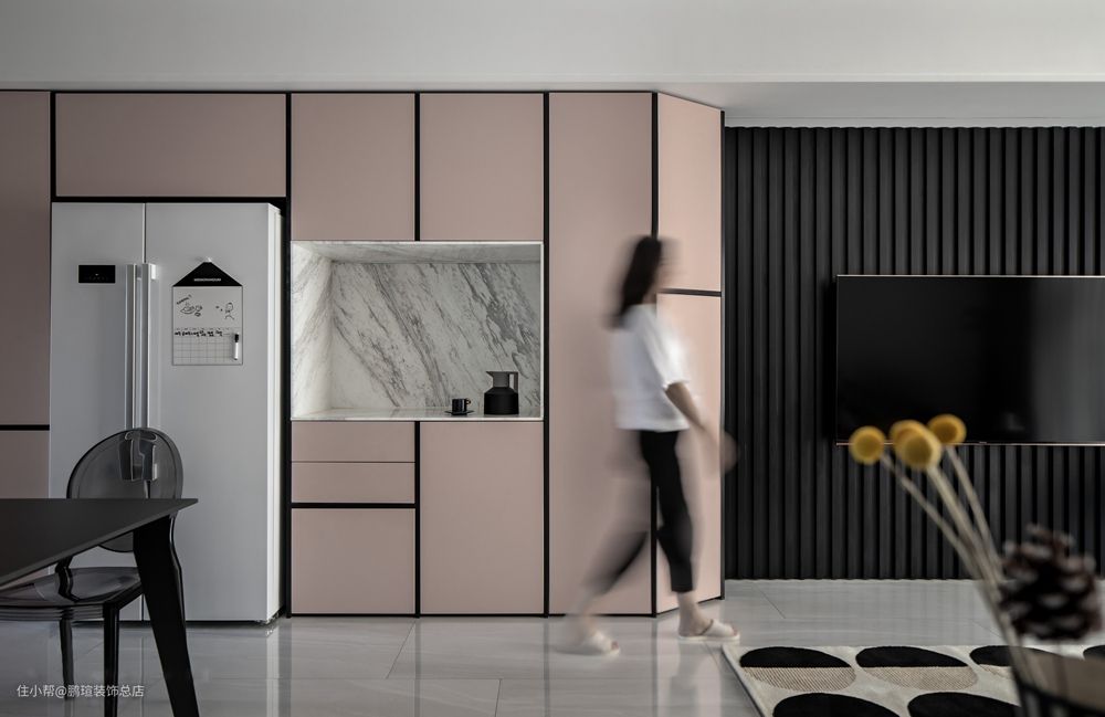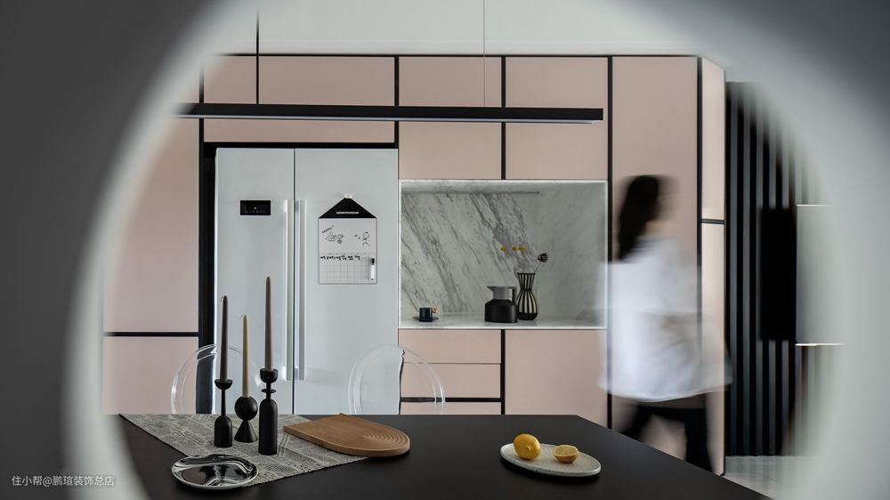 定制的餐边柜通顶打造,利用了整面墙的宽度,并将冰箱内嵌其中,粉色的柜门和黑色的柜门边线打造了餐厅空间色彩的主基调,浪漫时尚。透明亚克力餐椅兼顾舒适与美感,让空间更显轻盈。