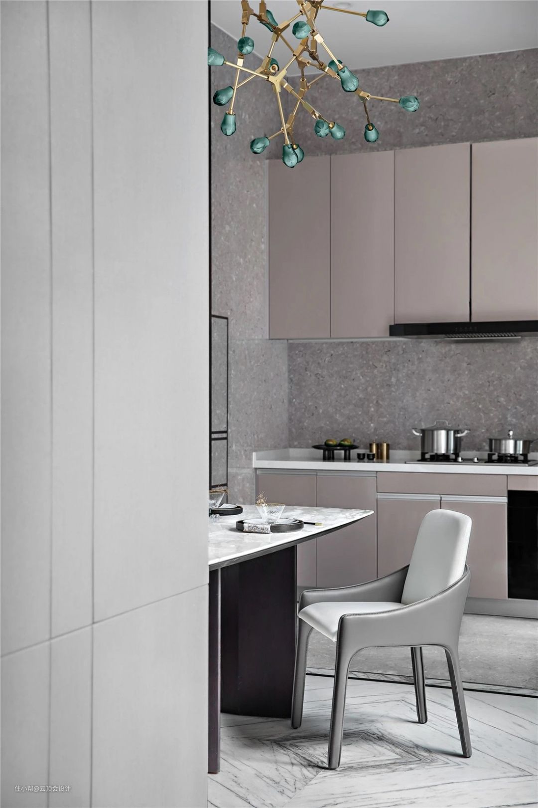 为了满足不同家庭成员的烹饪及饮食习惯,将此空间打造了“社交型厨房”,空间分工后,让中西厨都能有自己独立的空间去织造美食,每当食飨时刻来临,这里总是充满着温馨的言行,灯火影绘中使欢聚显得弥长珍贵。