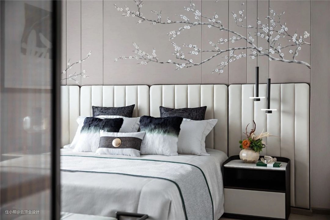 软包的床头背靠着‘竹态’纹样,柜体表面关不住的青山白雾,以现代抽象的手法表现中式韵味,当置身这种轻松舒适的空间里,切身感受到最好的时光就在此刻。