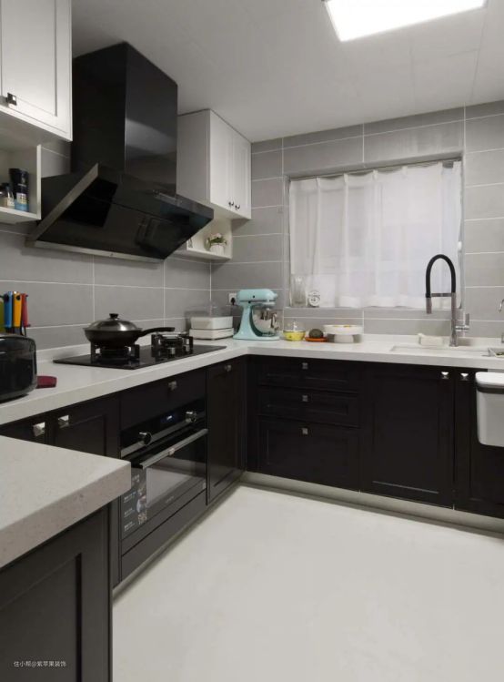 U型厨房,吊柜和地柜基本做满了,进门左侧也加了一个窄柜,平时买完菜回来直接放上面,非常顺手。因为装了垃圾处理器,一个悬挂垃圾桶已经足够。