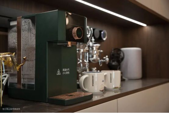墨绿色的IAM即热式饮水机????,和胡桃木搭配,顿生高级感。小爱音箱在这里也能方便控制。