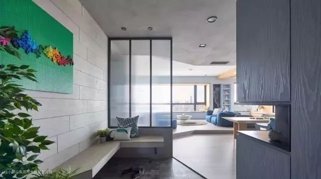 ▲ 玄关正对着的玻璃隔断,将客厅与其隔开,玻璃带来朦胧的观感。定制的L型悬空换鞋凳,满足多人同时换鞋,宽敞明亮。