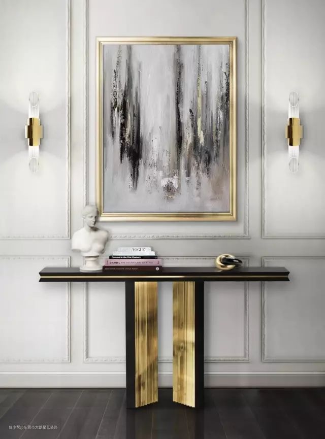 ▲ 进门处用冷色调人物挂画与黑金色玄关柜做搭配,为整个门厅渲染一种神秘、古典的氛围。