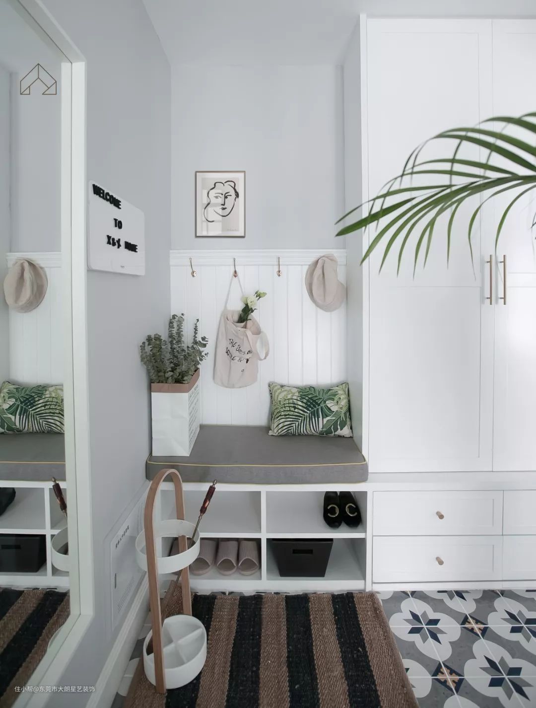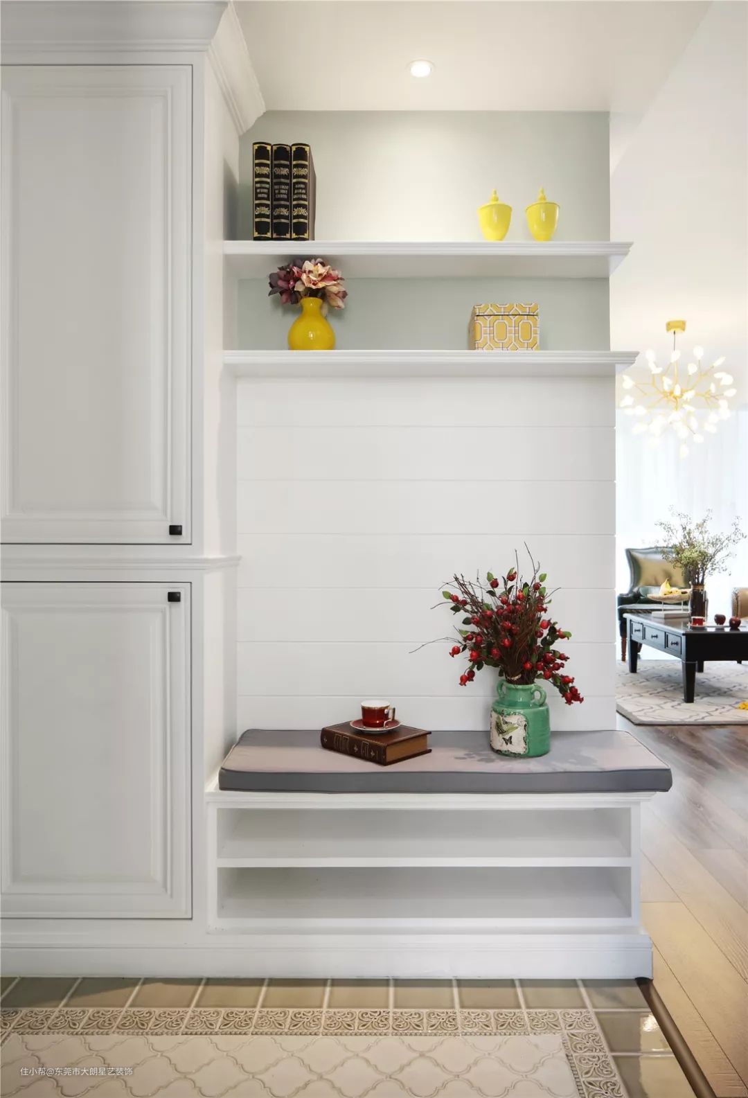 ▲ 玄关做了收纳柜+换鞋凳的设计,地砖铺得优雅大方,再加以精致摆件的装饰,整体舒心又温馨。