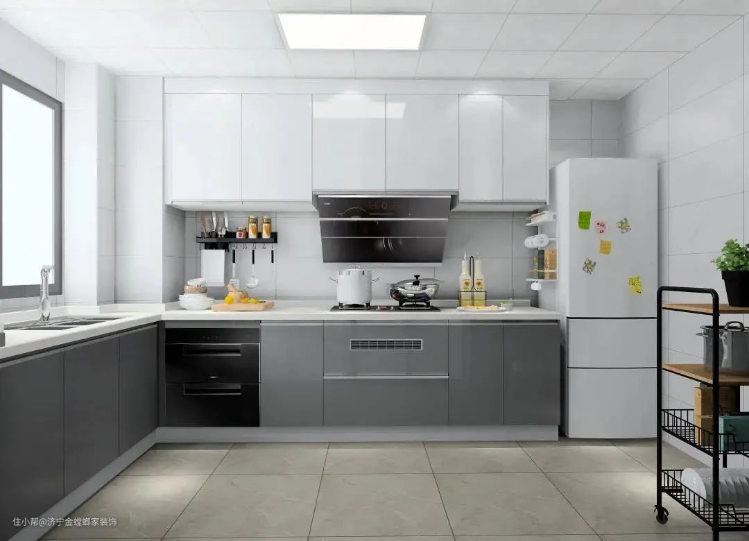 L型布局充分利用厨柜拐角处的死角,解决了转角空间的尴尬,整体布局灵活多变。但厨房流动空间比较狭窄,对人数有一定的限制。