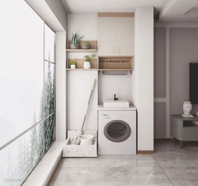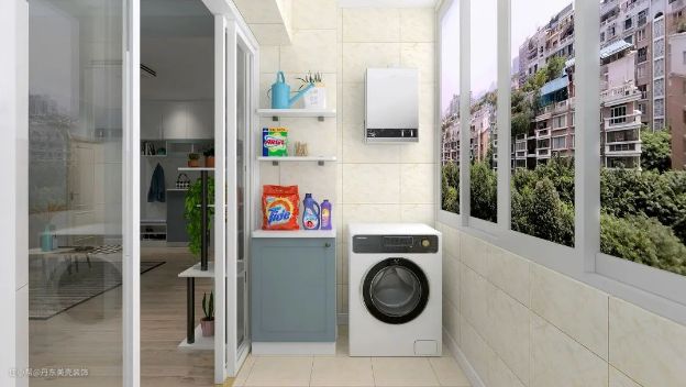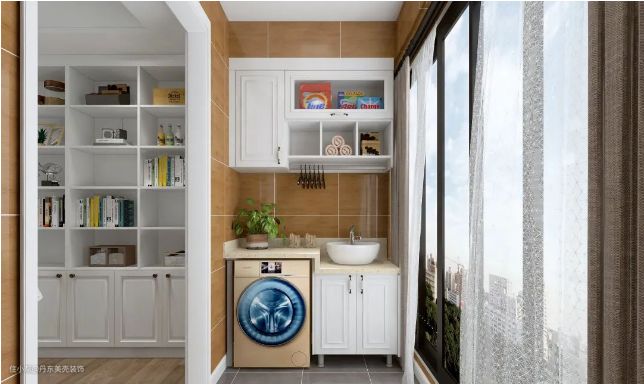▲ 家里只有一个阳台的话,可以设计成洗衣晾晒区。在客厅和阳台之间安装窗帘作为隔断,窗帘与客厅风格搭配和谐,避免客人来做客时尴尬。
