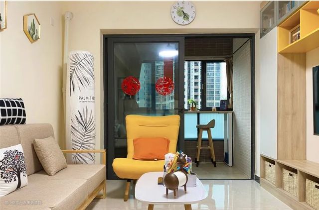 2、对空间进行功能划分,让阳台与客厅各自独立又相互联系;