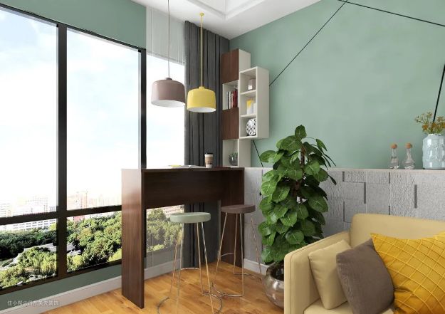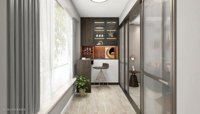 ▲ 在阳台角落设计一个吧台,一张拼接到窗边的小桌子加上两三把轻巧的高脚凳,简约又时尚。坐在吧台上办公或是喝咖啡,看看窗外的风景,也非常愉快。