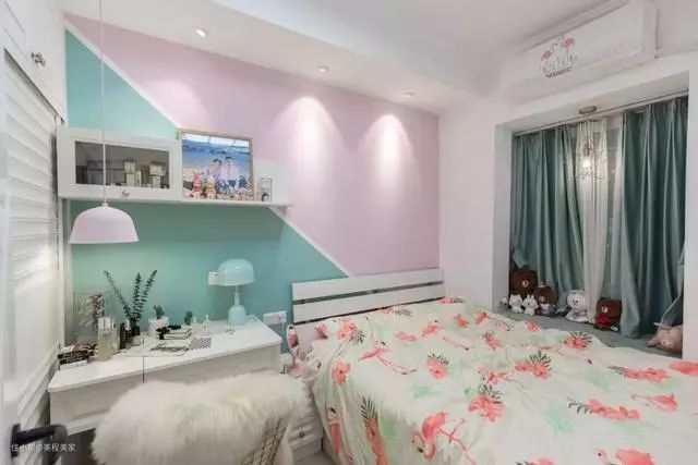 主卧墙的调色,低饱和度的灰绿色+奶油粉