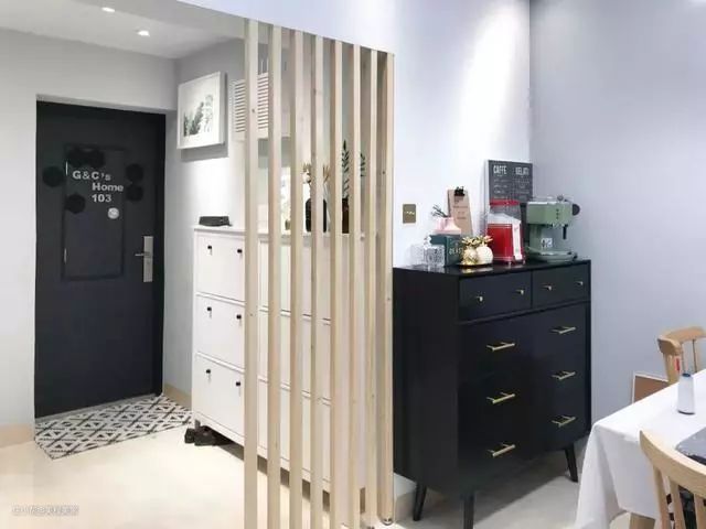 进门玄关主要构成是超薄鞋柜和木栅栏。