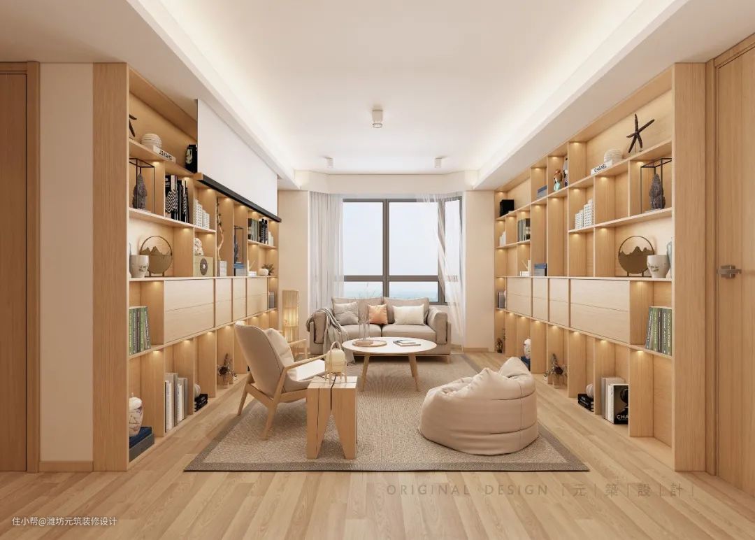 2丨客厅双侧开放式书橱,增加收纳功能。无电视化,使用幕布投影功能。