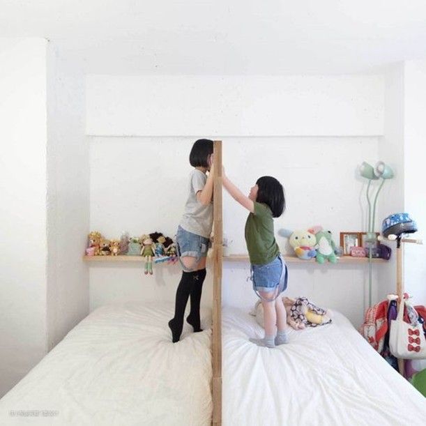 最简单的一种隔断法,就是跟日本业主学习一块板的分隔法,将两张床分成独立的空间,上方不到顶,还能满足孩子的互动。