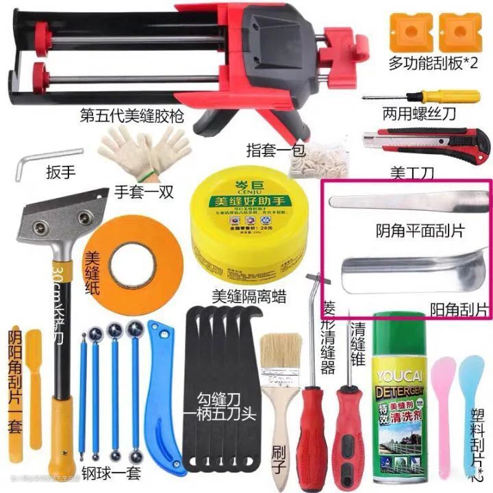 阴角平面刮片/阳角刮片:打胶后,需要将其刮平以使填缝更均匀。