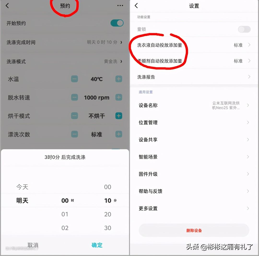 ▲通过米家APP可以对洗衣机进行每一个功能的深度自定义,比如说单脱水的话,最高转速是1200转每分钟。虽然没有达到1400甚至更高的转速,但是日常使用足够了。而在水温调节上最高能达到90度。另外洗衣液和柔顺剂的自动投放量也可以进行单独调节。平时用的比较多的功能估计就是预约了,上班可以远程预约清洗衣服,或者是预约在晚上谷峰用电时段,还能省电。