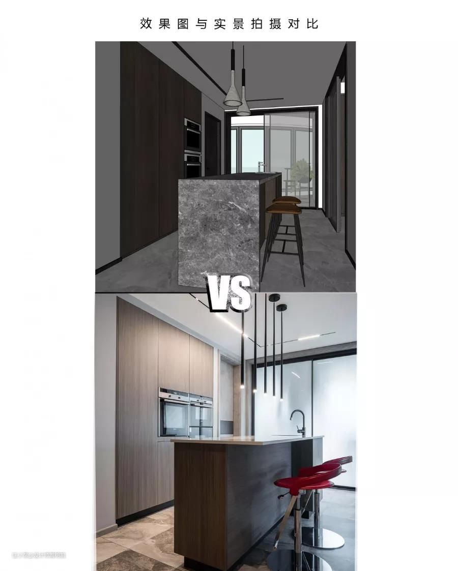 西厨满足了早餐台的功能,以及西式料理电器的布置。西厨的储物柜,借用了储物间的空间纵深。西厨的灯光,用网红吊顶和磁吸轨道灯来衬托整个空间的照明氛围。