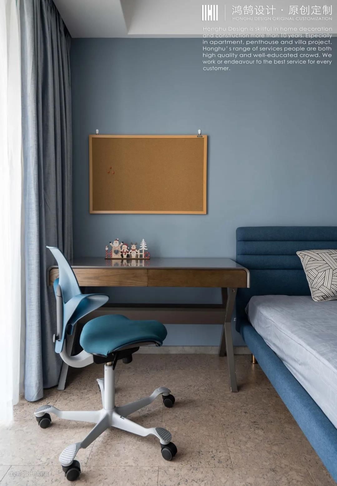 男孩房在颜色和材质方面,也结合了小朋友的喜好,利用天空蓝色的乳胶漆,结合白色有肌理的木纹做了材质上的呼应。