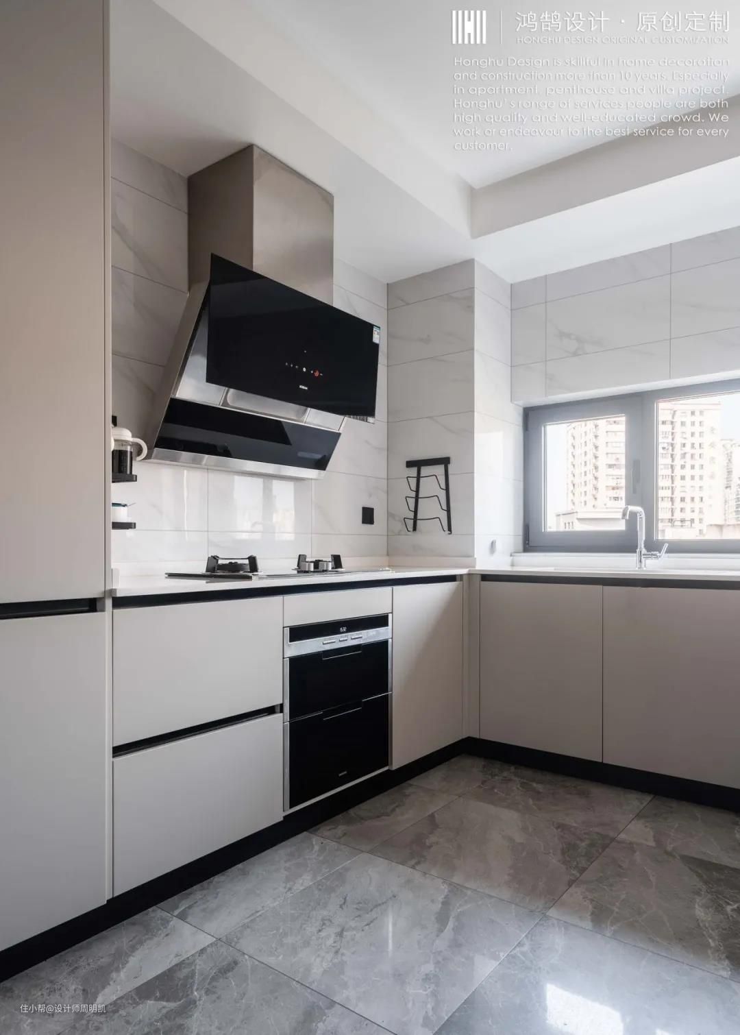 厨房橱柜采用了奶油灰的哑光烤漆面板,使厨房空间的颜色更加有质感;做了嵌入式的洗碗机和消毒柜,整体搭配比较协调。厨房墙面用了仿爵士白的瓷砖,地面用了仿大理石的地砖,保持了空间整体的一致性。原来厨房的空间比较宽敞,所以我们没有采用大面积的平面吊顶,而是利用局部吊顶的层次,增加空间的高度。