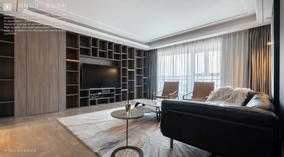 客厅的设计规划上,男业主有很多的手办和高达,希望在客厅的敞开区域进行展示。所以我们结合了电视柜的功能,做了一面装饰柜,同时做了一扇隐形门,隐藏了客卧的进门,这样可以让整体空间保持一致性。