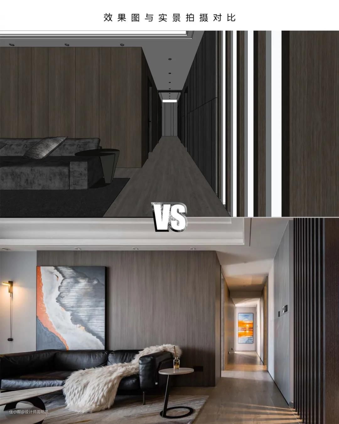 走廊的左右两侧,分别利用了木饰面和仿岩石的瓷砖,进行空间宽度的拉伸,同时植入了线性光源,分割墙面的狭长感。