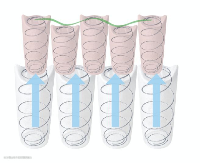 舒达这个品牌最大的卖点是独家专利的妙而扣弹簧,这一款床垫配置的是左右旋独立袋弹簧,它的特点是用两种弹簧间隔排列,实现一左一右正反受力,相比起普通的独立袋弹簧而言,它可以避免受力倾斜的问题,支撑性和静音抗干扰能力都有所提升。