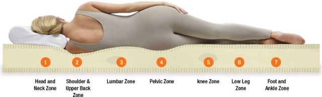 除了纵向结构的分布,对于一张好的床垫来说,在平面上也会依照人体各个部位的重量分布以及脊椎的正常曲线来设计。如果平时比较注意体态的人可能会注意到:人在处于站立和卧姿时,体态构造是有很大变化的,主要体现在几个方面: