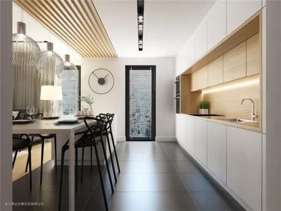 ▲ 在兼作为餐桌的厨房岛之上,三个厨房吊灯悬挂在装饰性的木条上,并贯穿整个中央台面。