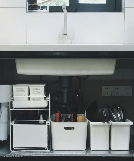 厨房水槽下,大多数人家都是没有充分利用的,对于小厨房来说,物品又很多。可以使用水槽下抽拉置物架,颜值真的很高,而且是双层抽拉设计。