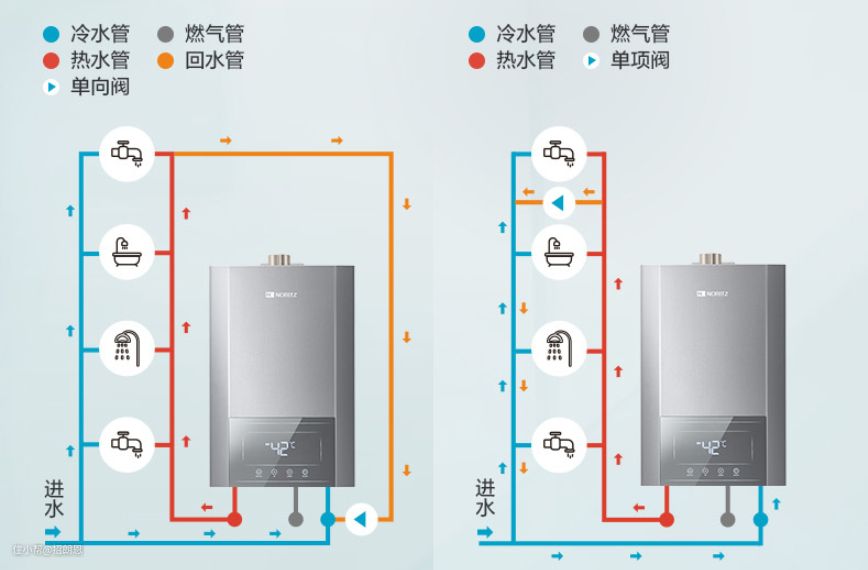 零冷水燃气热水器有两种安装方式,一种要求我们家里装修时布置了回水管,另一种适合已经装修好,没有布置回水管的家庭: