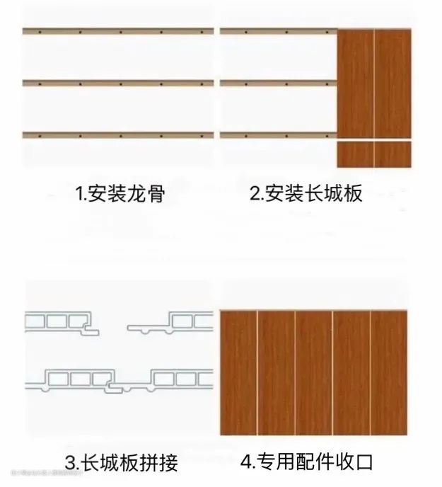 长城板最常用的位置就是墙面,墙面的安装工艺比较简单,施工流程为:检查墙面→整理墙面→安装龙骨→安装长城板。