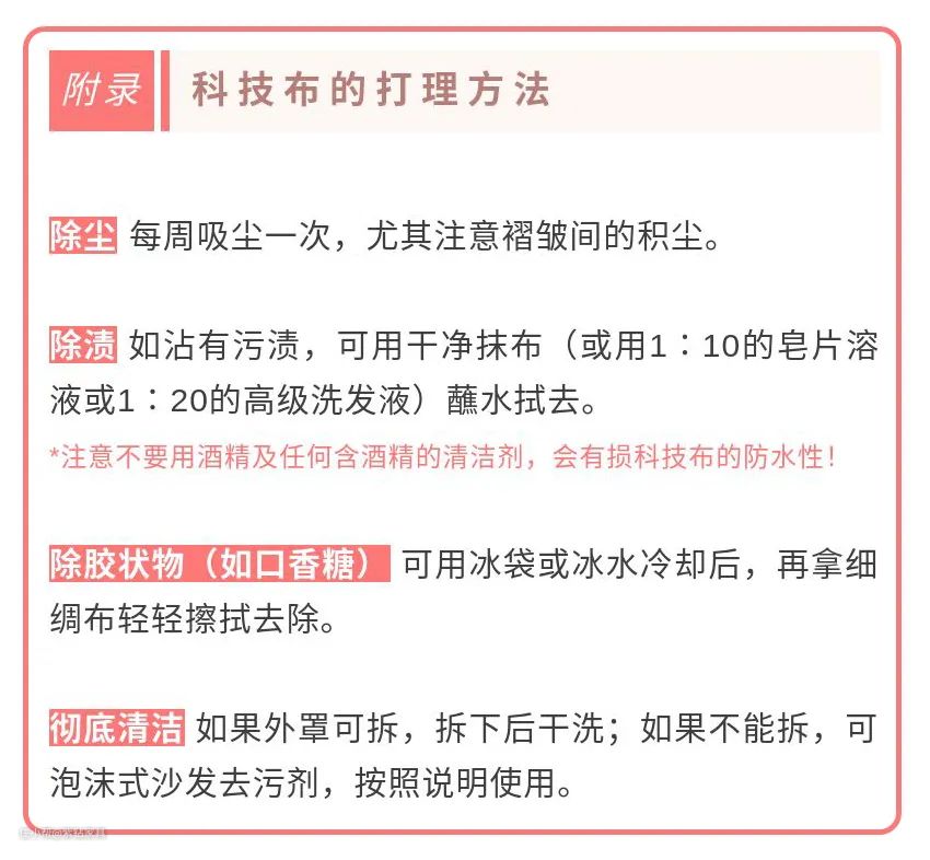 虽然说科技布本身有防水防污的特性,这让日常的简单打理变得更方便了,但也是相对而言。
