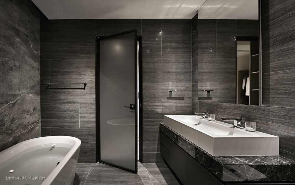 小平米或采光不佳的卫浴空间,可以选用通透的玻璃门,不但可以放大空间感,还能增加明亮度、营造轻盈感,但玻璃上的指纹、脏污,会较为明显,需常常清洁擦拭。一般而言,浴室玻璃会以厚度12mm的钢化玻璃材质来打造,较为安全坚固,若是介意隐私的业主,则可以选用雾面磨砂玻璃,不但能呈现半透光状态,也具有明确划分区域的作用。