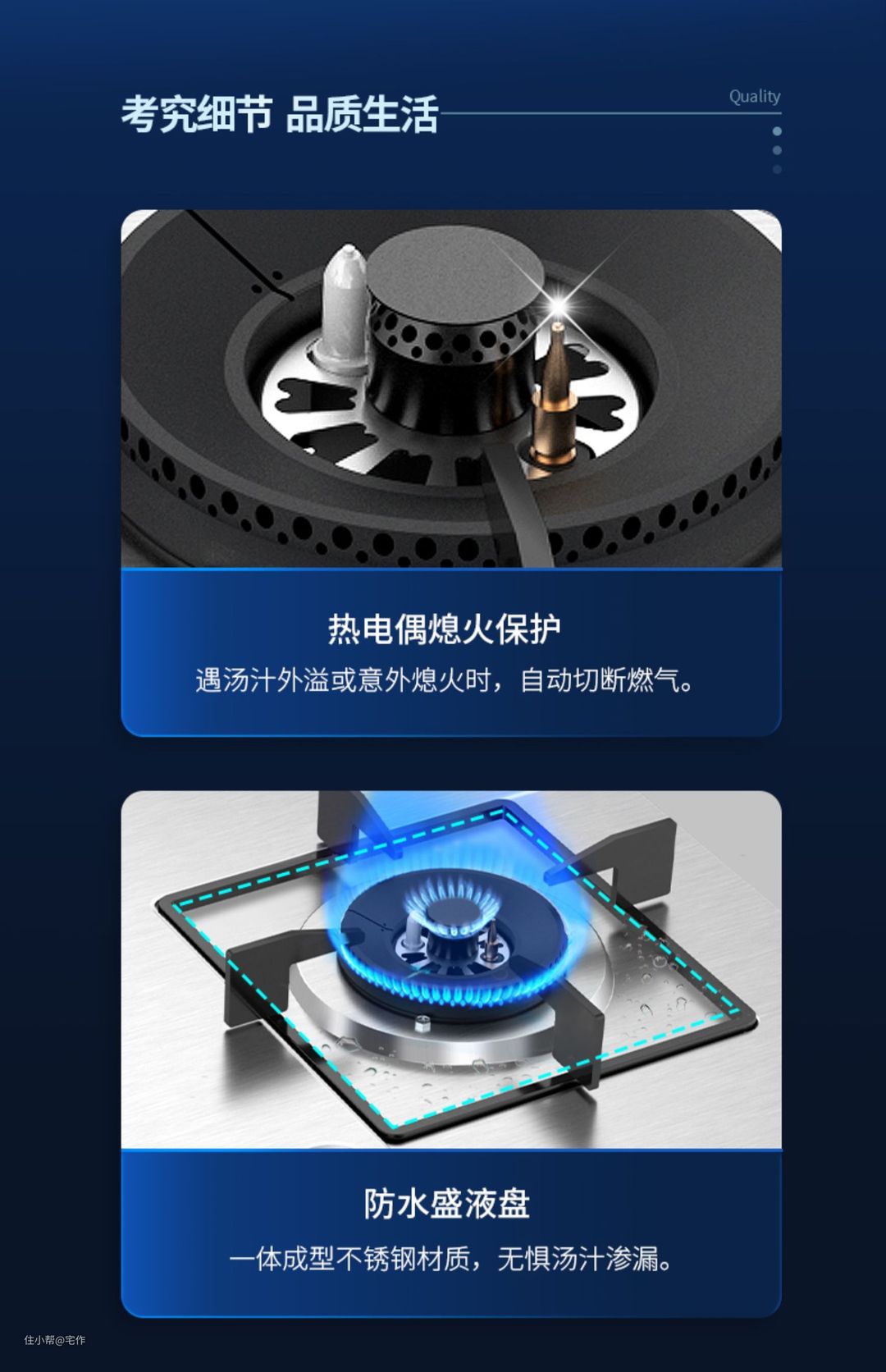 5、安全性:主要为熄火保护装置,这也是国家明确要求的配置;所以只要是正规产品,肯定有该配置;目前主流方式为热电偶方式,原理一样,区别主要在于热电偶的厂商不同;除了热电偶式,还有一种叫做离子感应式,由于过灵敏,通常安装在相对封闭的环境中,比如燃气热水器;在燃气灶中,目前也就华帝部分产品有使用;