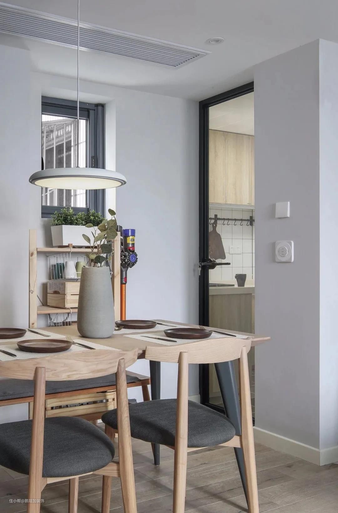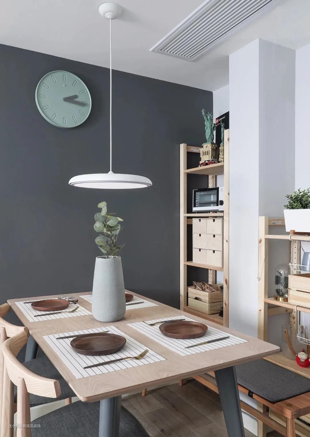 餐桌旁的墙中有一根梁柱,于是设计师在两侧依势定制了原木色收纳架,这样一来,便不会显得突兀,也让餐厅的整理收纳变得更方便,搭配一些花卉绿植,清新自然,让人心情愉悦。