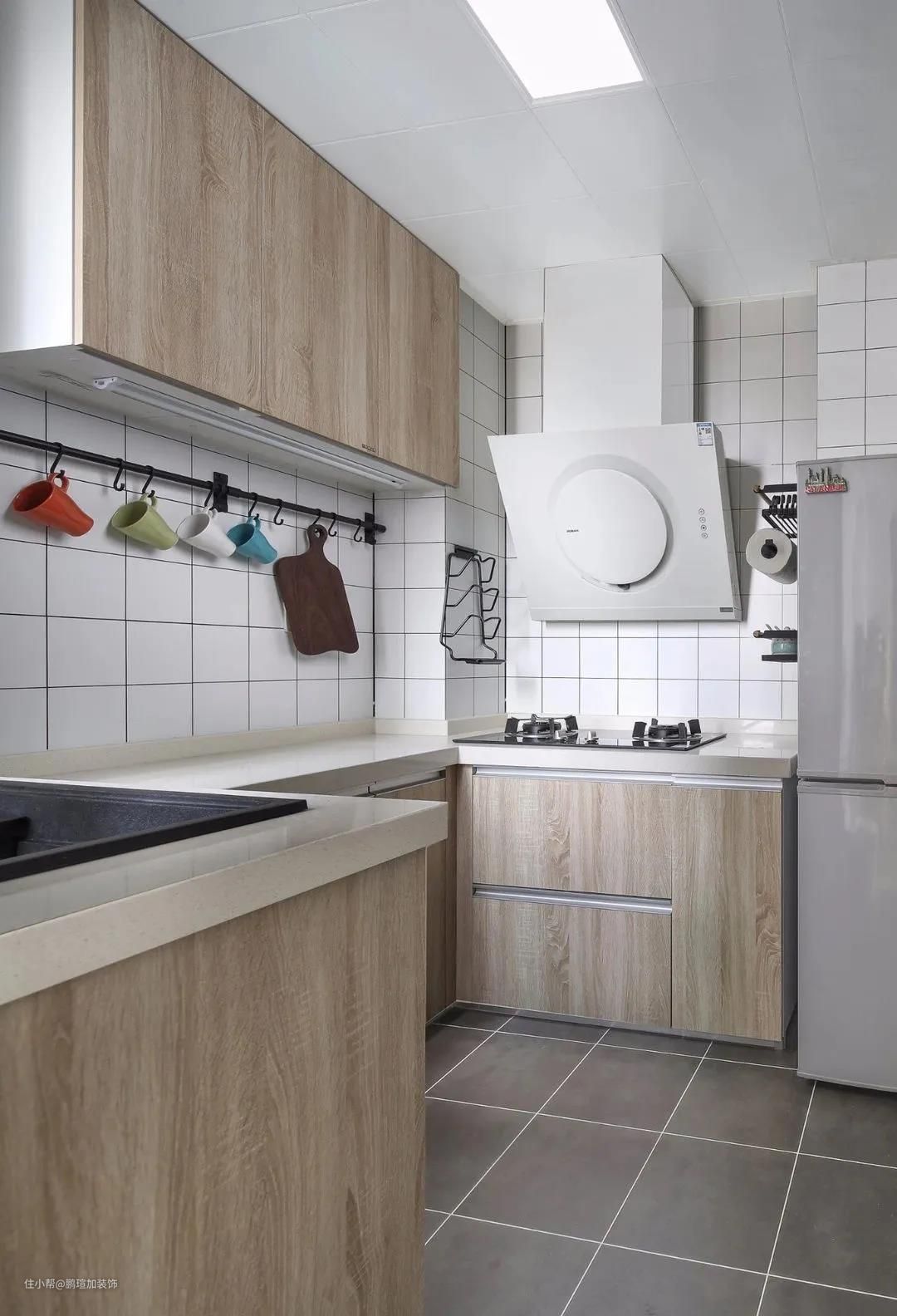 厨房铺设了灰色的地砖,耐脏防滑,墙面则贴了白色小方砖,洁净清爽,整体定制了原木U型橱柜及“一”字型吊柜,同时预留出冰箱的摆放位置,布局非常合理,操作台上方安装了横排挂钩,方便又实用。