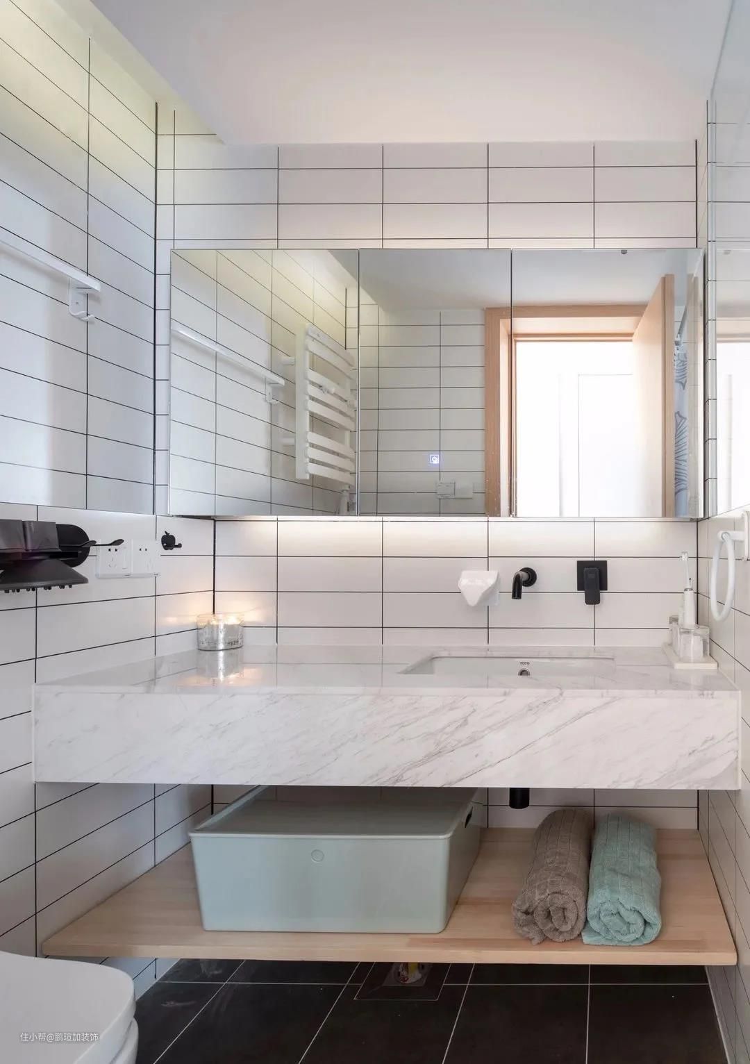 卫生间以经典的黑白色为主基调,悬空定制了大理石洗漱台,高级而有质感,底部设计收纳隔板,提升储物空间,墙面安装了一面镜柜,精美实用,完全跳脱了小户型的格局,效果非常棒。