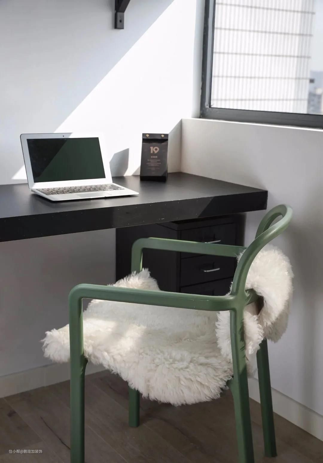 主卧原本是自带一个小阳台的,家装时拆除了多余隔墙,直接纳入设计,单侧摆放了黑色小书桌及一把绿色座椅,精致而优雅,老公不愁没地儿加班了。