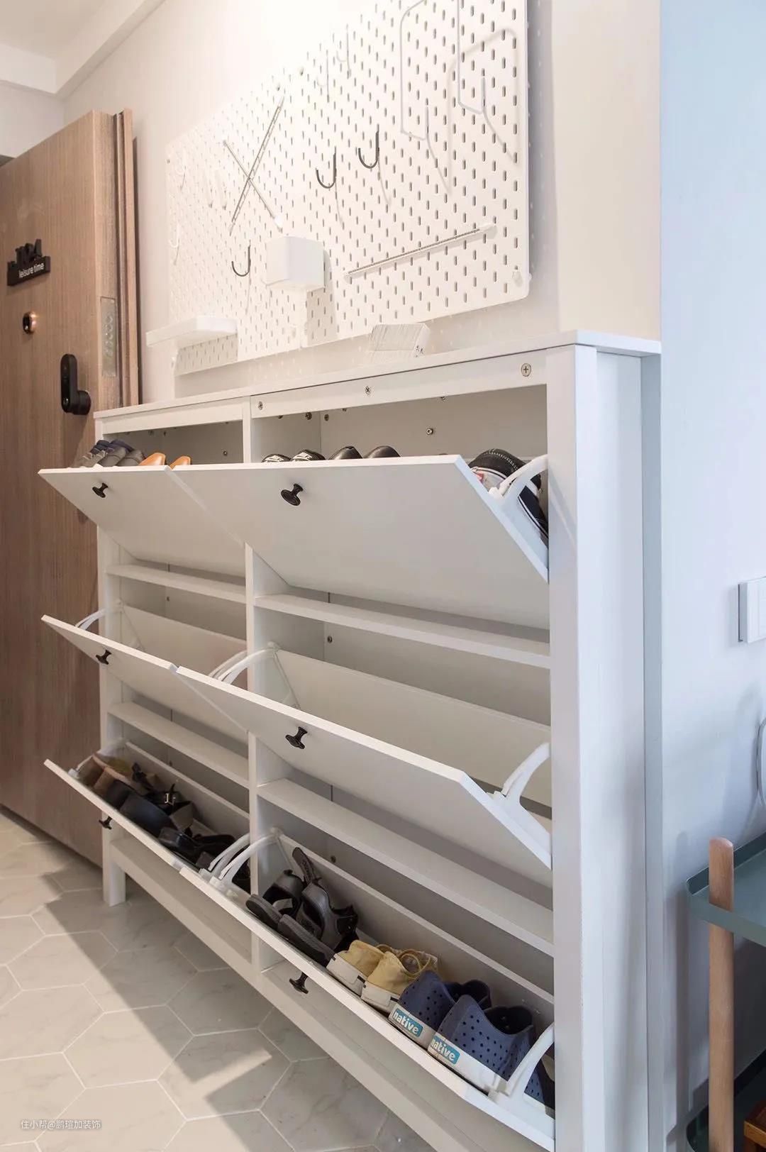 房子是典型的小两居,决定了入户门厅不会太大,于是设计成玄关走廊,左侧区域摆放了从IKEA买的个白色半墙鞋柜,整理收纳鞋子很实用,又不占空间,上部墙面安装了可调节挂板,悬挂一些钥匙、包包等随手物品,灵活方便。