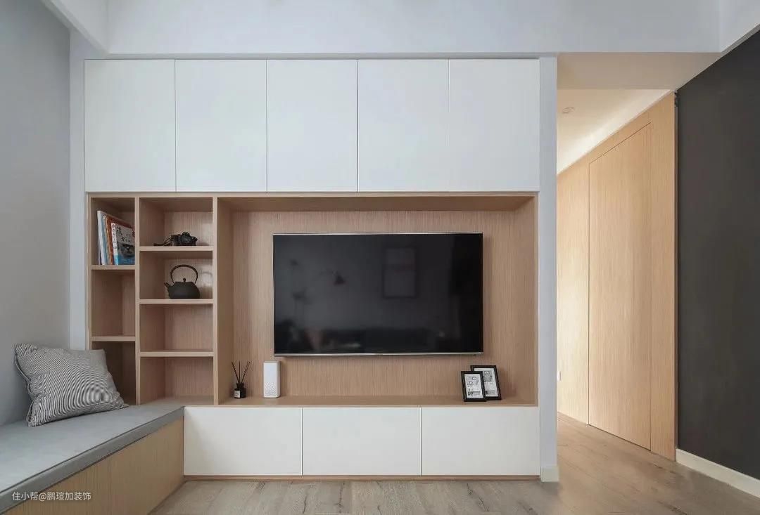 榻榻米卡座连接电视墙,整体打造成收纳储物柜,敞开+封闭的结合设计,纯白+原木的色彩搭配,实用大方,又不乏美感,电视机采用悬挂式,节省了不少空间呢。