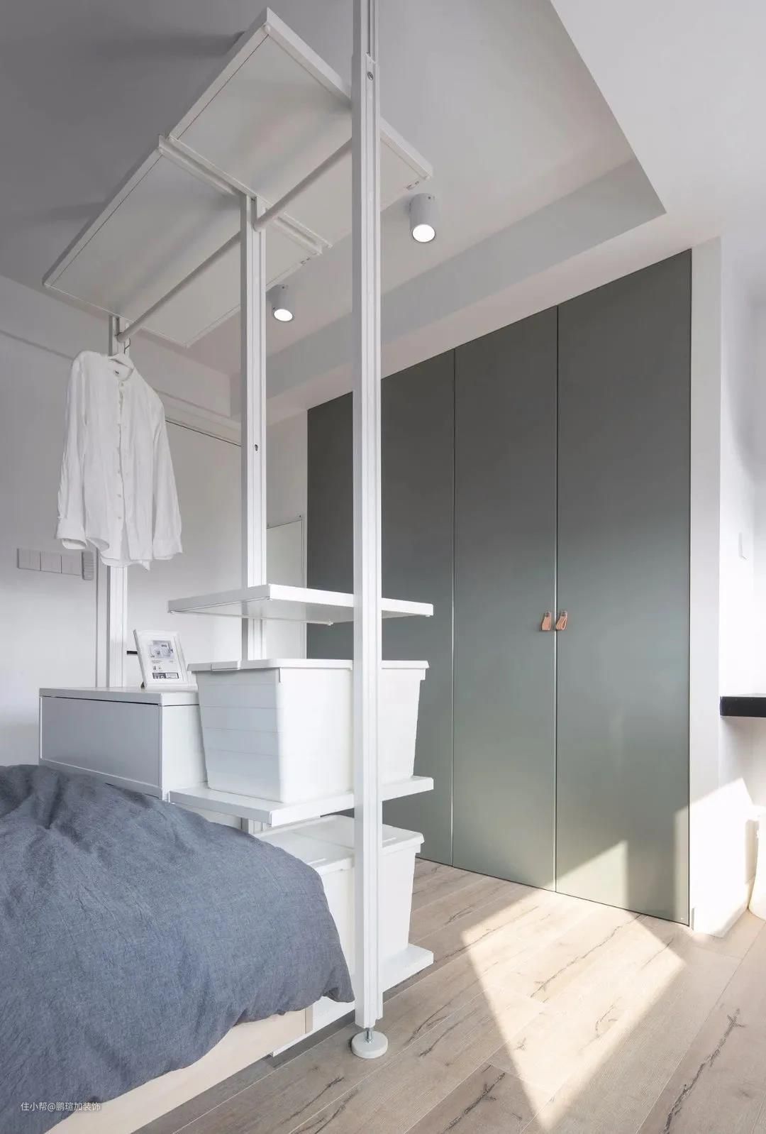 床尾区域设计了置物架+储物盒,扩充了收纳空间,靠墙整面定制了一个墨绿色的通顶衣帽柜,极大地满足了生活储物的需求。