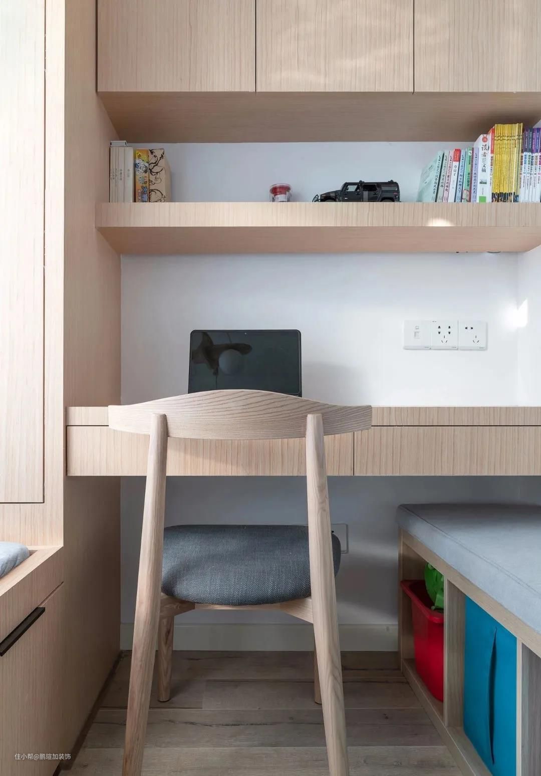 书桌台面上方定制了原木吊柜,摆放孩子的书籍和学习用品,特别方便。