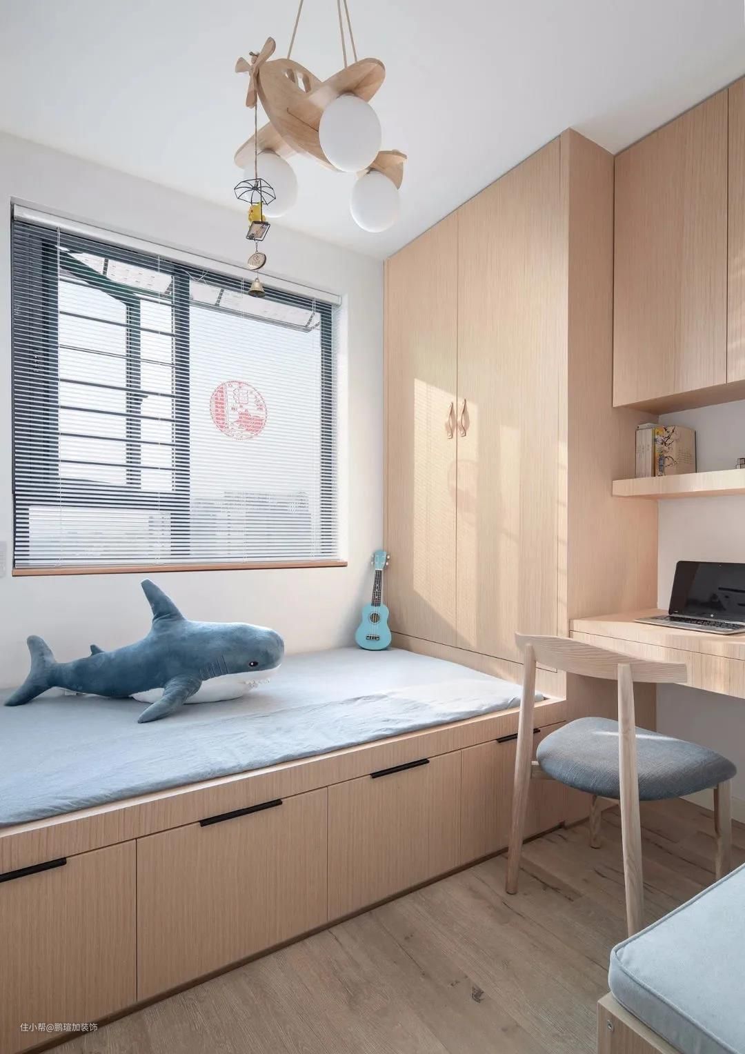 儿童房整体以原木+牛奶白+浅蓝的色调进行搭配,一体定制了榻榻米+衣帽柜+书桌,舒适的布局,让空间充满协调统一的美感,而且储物空间很充足。