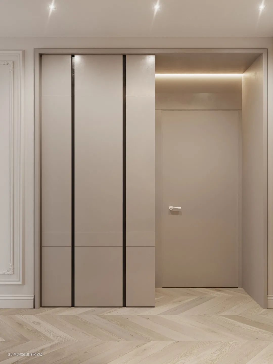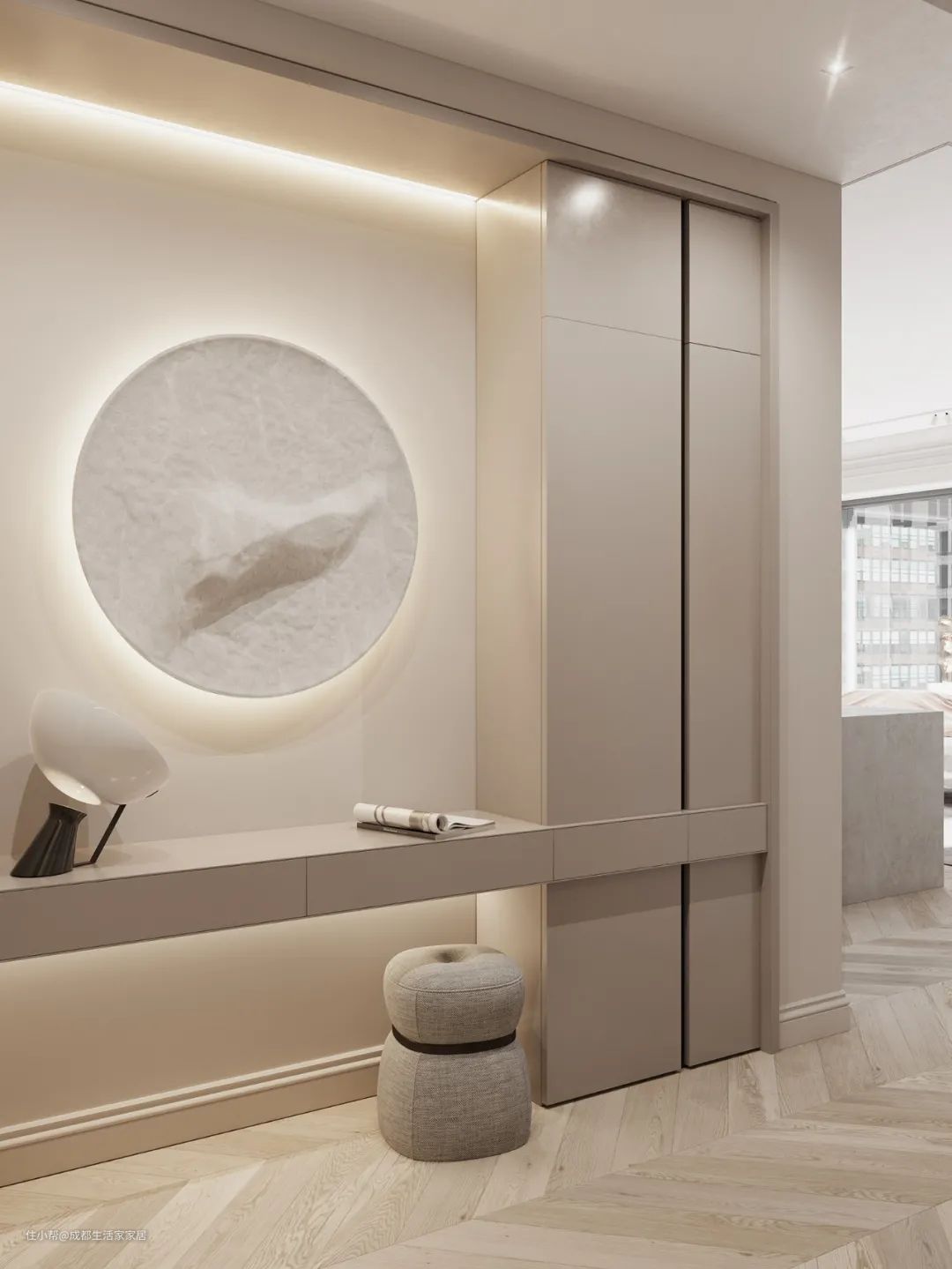 入户的位置尽可能保持简约的格调,柜体的设计带有极简主义特有的体块穿插感,玄关的圆形艺术装饰后方暗藏了光源,从进门开始,就有满满的高级感。