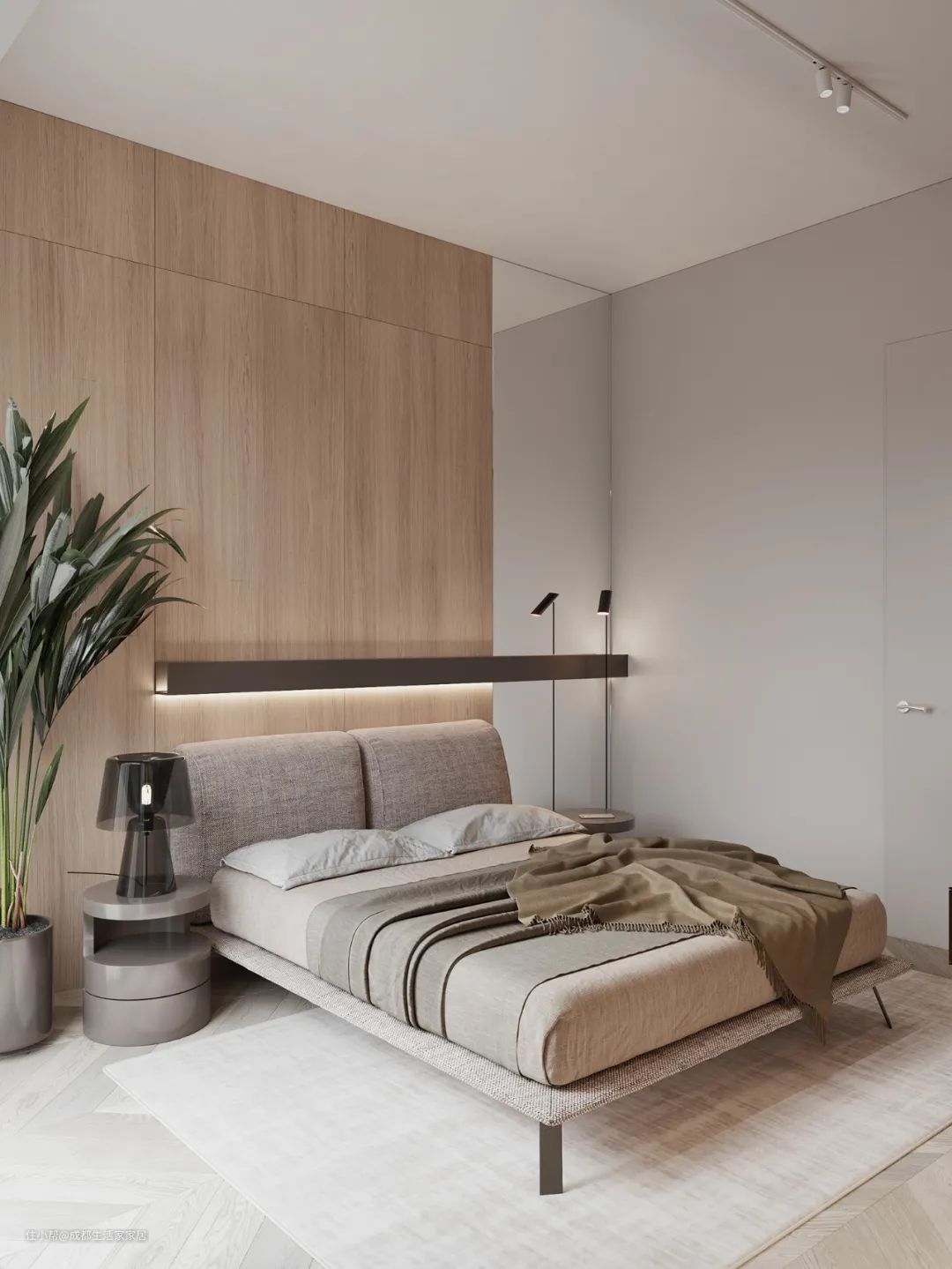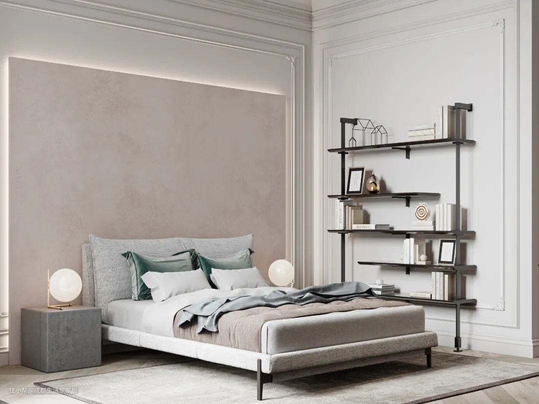 床头柜是两个灰水泥色盒子,软皮质的外观质感十足,是整个空间中最为深沉的色调。