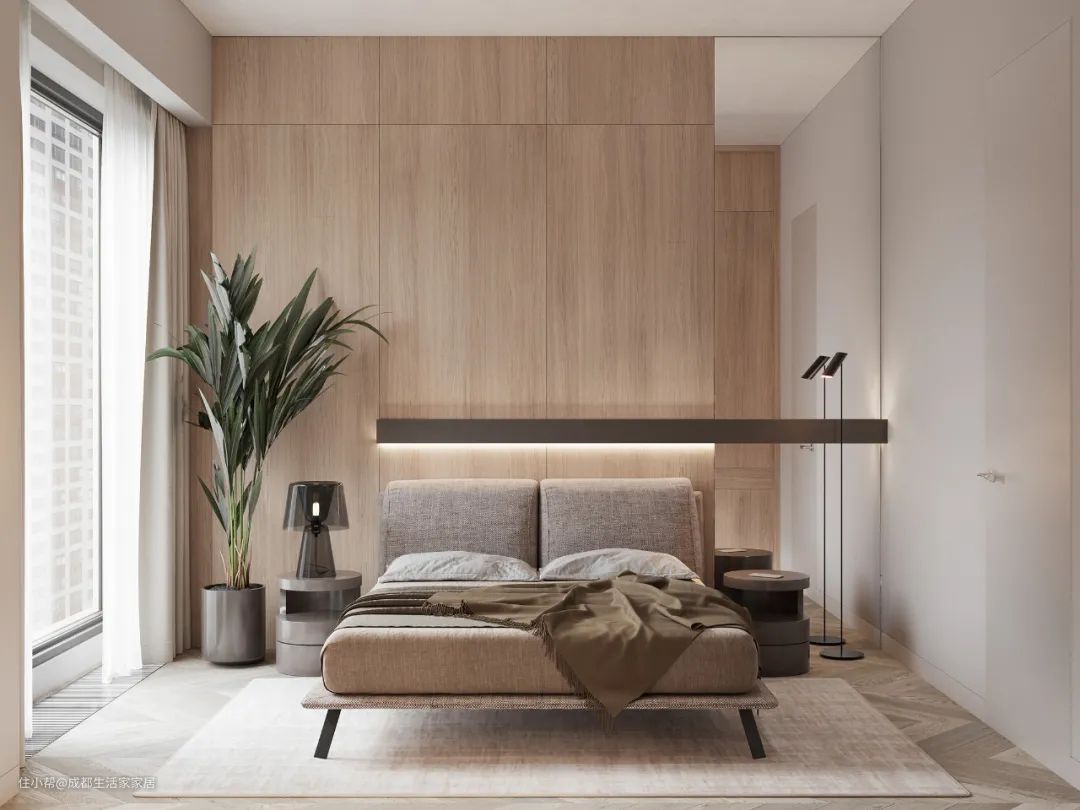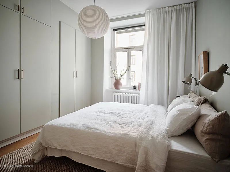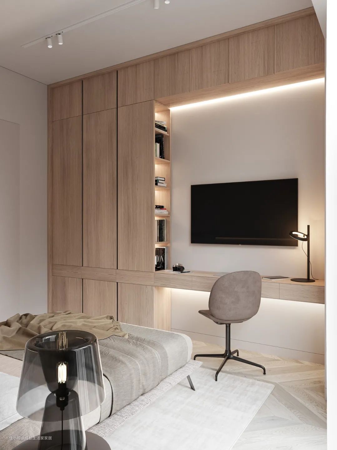 靠墙面使用木质打造了一面的收纳柜,除了书籍和衣物的收纳之外,还留出空格设置了书桌,简约的黑色台灯散发着柔和的光源,阅读与书写都变得更加有仪式感。