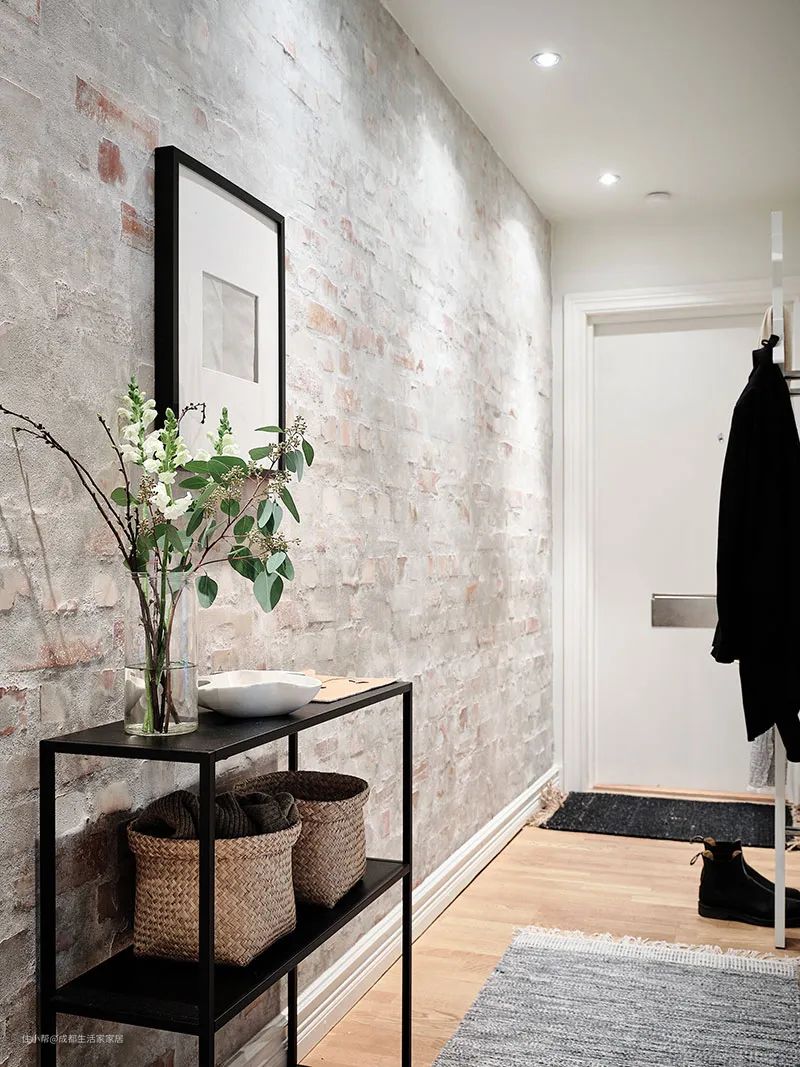 玄关裸露出整面斑驳痕迹的墙面散发出自然地气息,原木地板、少许的绿植搭配、表达出岁月静好的那份温柔。
