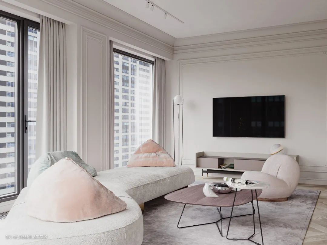 客厅两面大落地窗将城市景色尽收眼底,墙面使用石膏线条勾勒出优雅的造型,淡淡的米色、蓝色与珊瑚色将空间的灰调与现代优雅的形态相结合,浪漫而精致。