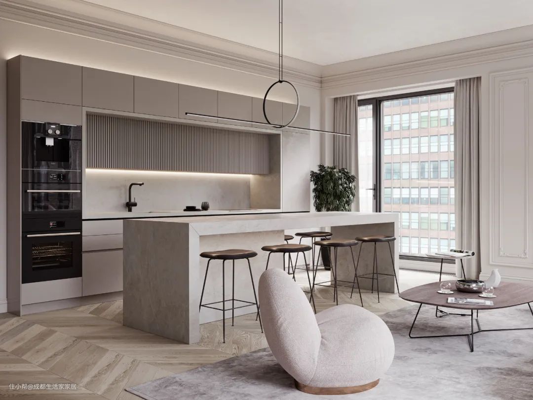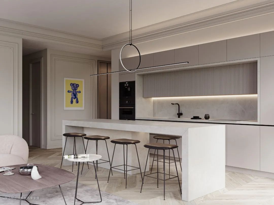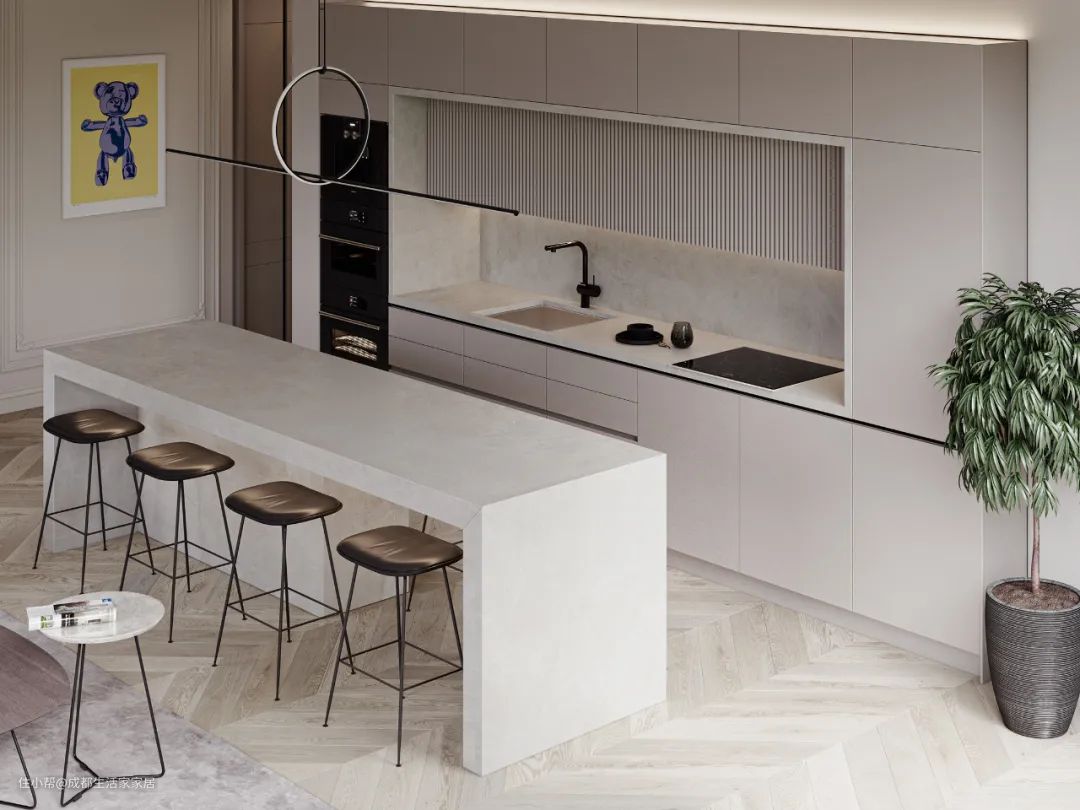 年轻人更喜欢极简主义带来的简约和禁欲感,米色调与极简的线条感整体效果和谐,温暖而舒适。超长的大理石吧台不止满足家人的日常就餐,还是提升整体氛围的利器。